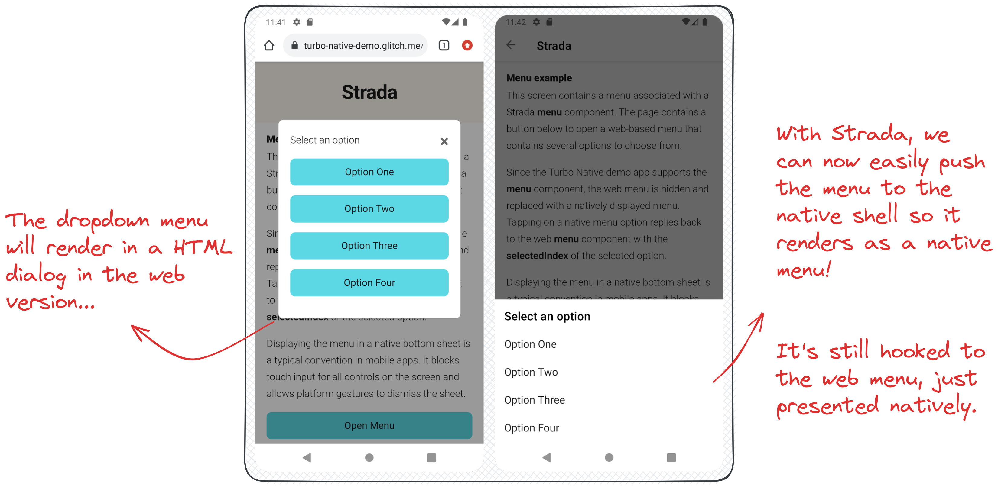 Or instead of showing dropdown menus in the WebView (which might break the illusion of native), we can now make a fully native menu component for our dropdowns: