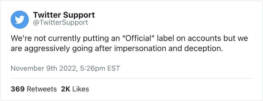 Twitter允许任何人购买蓝 V 认证,就像哈佛大学允许任何人购买学位一样:当任何人都可以得到它时,价值主张就会消失。可以预见的是,Twitter的一些人意识到他们需要在蓝 V 之上有一个新的层级,以保持地位等级。甚至在8美元的蓝 V 订阅服务上线之前,已经有人认识到了: