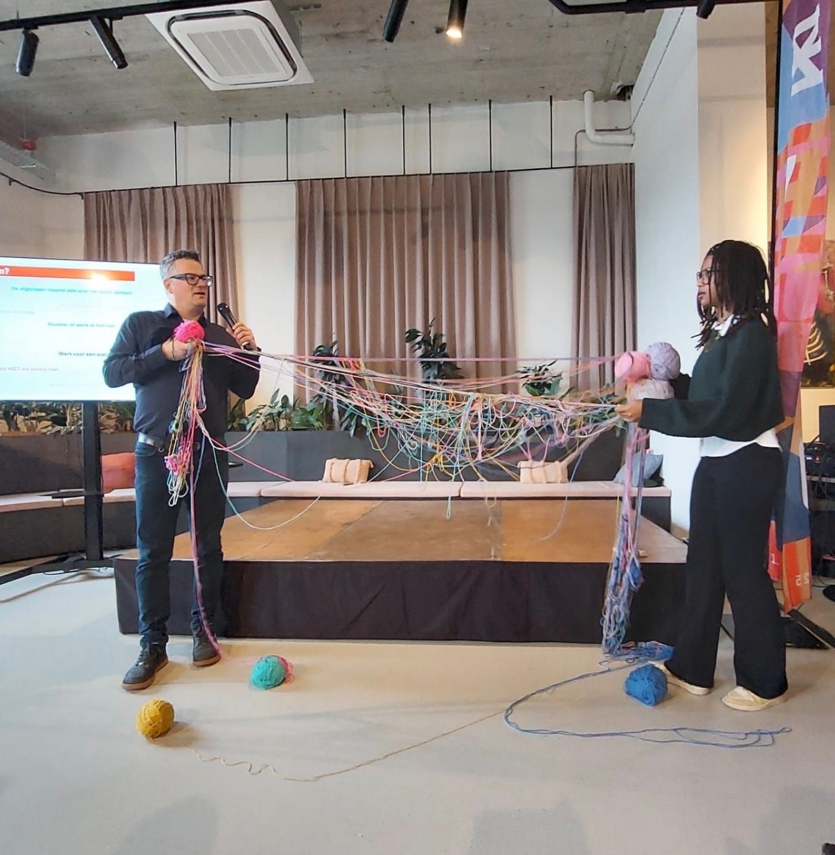 'Wol-ie weven?' - zo noemden Ayesha en ik onze openingsact als dagvoorzitters bij de CityDeal Kennis Maken Kennisdelingsdag, afgelopen vrijdag. Bollen wol door de zaal gooien, verbindingen maken, letterlijk een netwerk weven van alle betrokkenen. Prachtige chaos ontstond - mensen verweven met draden én ideeën. Want zo weef je ook kennis: samen, spelenderwijs, met ruimte voor onverwachte verbindingen.