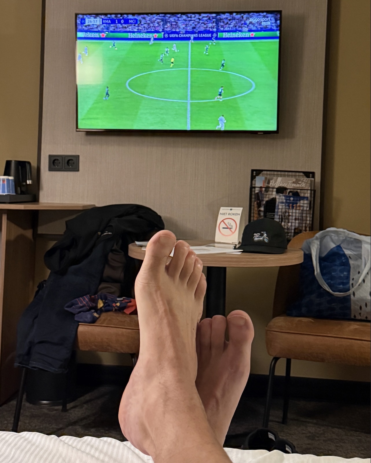 Real Madrid tegen Manchester City op een flatscreen in een hotelkamer, een paar weken terug. Voeten omhoog, sessie doorgenomen, puntjes op de i gezet. Morgenochtend vroeg sta ik in een zaal vol mensen van Carmel College — maar nu is het zaak om keihard te ontspannen, zodat ik morgen top kan presteren. (En niet in de file beland.) Dit is horizontaal werken op Champions League-niveau.